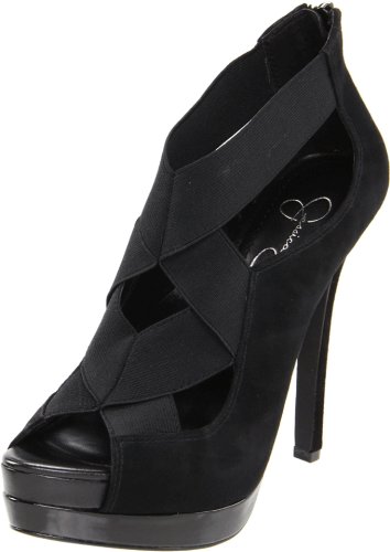 Your inner vixen will show through in this wow style from Jessica Simpson. Estas is draped in a beautiful black suede and features a zipper in the back and intertwining elastic straps at the vamp. A perfect 1 3/4 inch stacked platform and 5 inch stiletto heel combines the perfect lift of height.Jessica Simpson Women's Estas Pump Specification